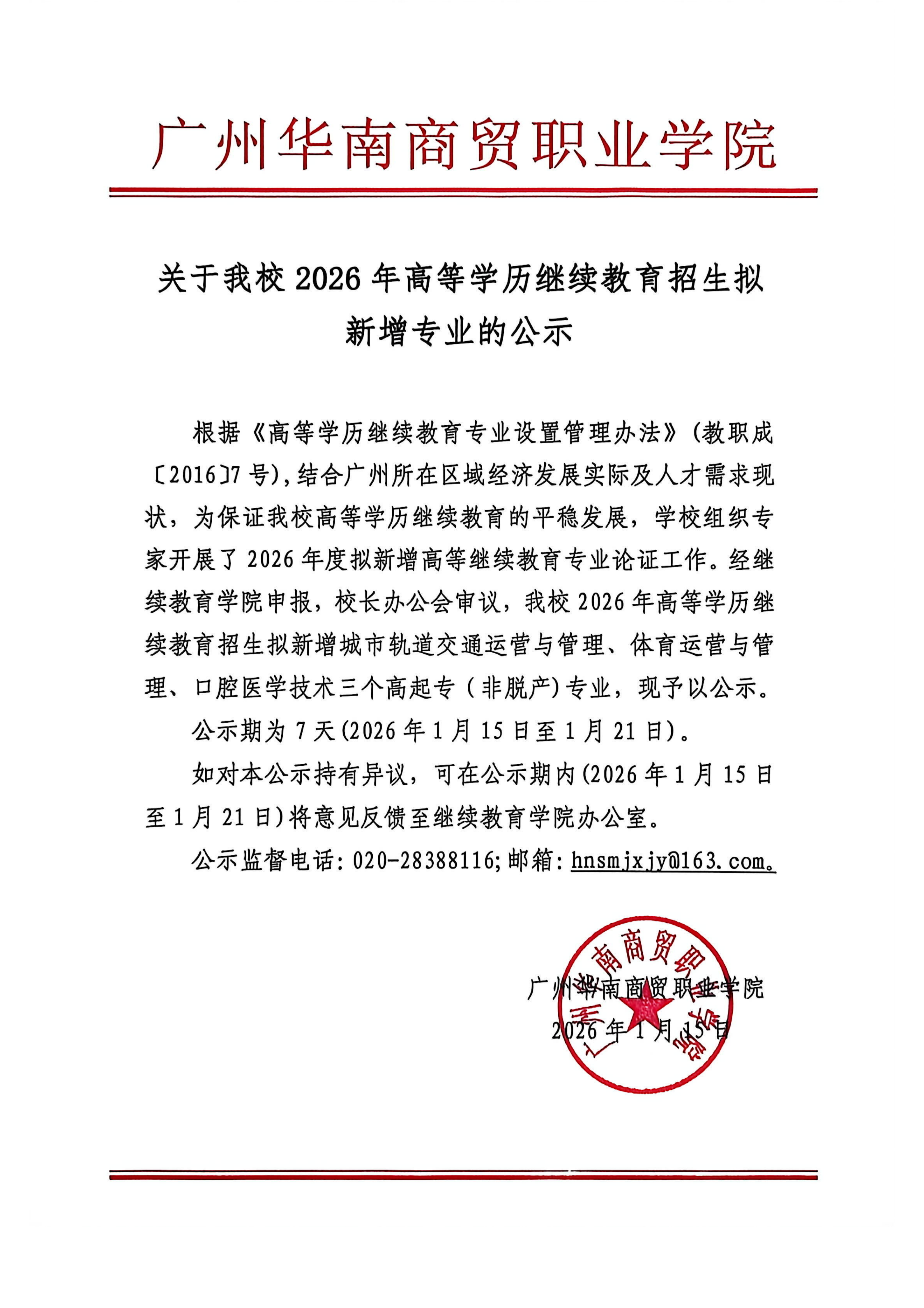 关于我校2026年高等学历继续教育招生拟新增专业的公示