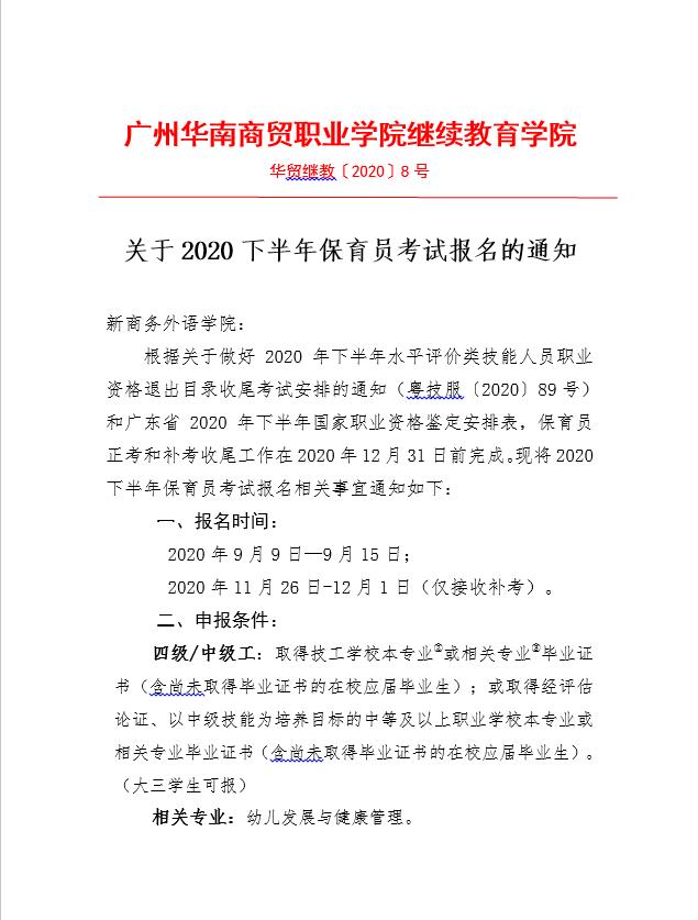 关于2020下半年保育员考试报名的通知