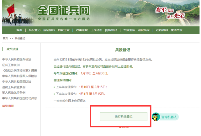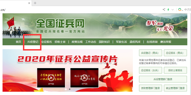 1、登陆全国征兵网(https://www.gfbzb.gov.cn/),选择左上角“兵役登记”;