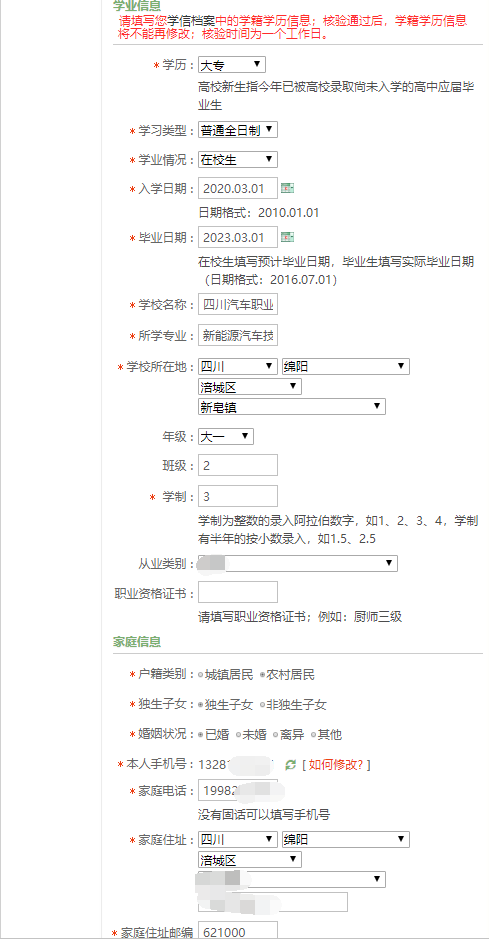 6、填写“补报名校验码”,根据自己实际情况填写“基本信息”、“学业信息”、“家庭信息”及“参军信息”,上传“近期一寸免冠照片”,信息填写参考如下;检查无误后点击“确定”;