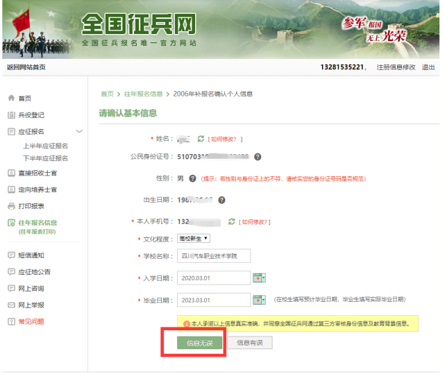 7、检查确认基本信息无误,点击“确认无误”进入下一步;检查确认学籍学历信息无误,点击“学籍学历信息无误”;