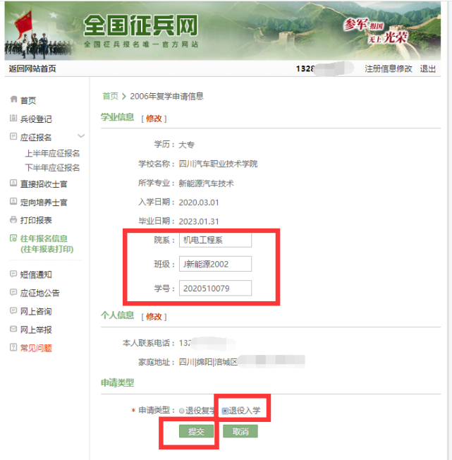 11、完善“院系”、“班级”、“学号”等信息,“申请类型”一栏凡为高职扩招退伍军人,全部勾选“退役入学”,检查确认点击“提交”;
