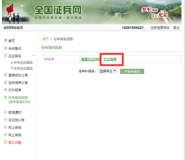 5、选择补报名年份(补报名最早年限为2006年入伍,其余学员手填申请表),点击“开始补报名”,开始录入应征信息;