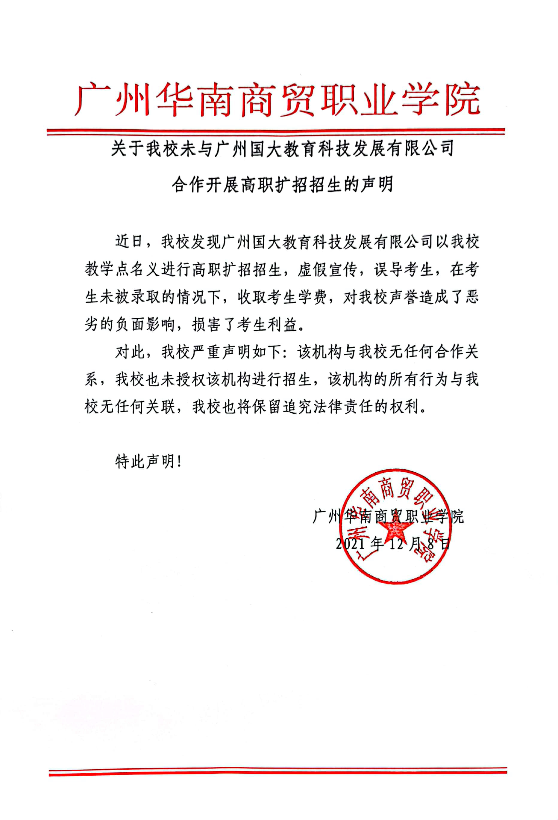 关于我校未与广州国大教育科技发展有限公司合作开展高职扩招招生的声明