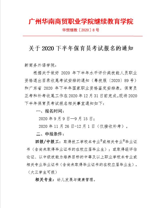 关于2020下半年保育员考试报名的通知