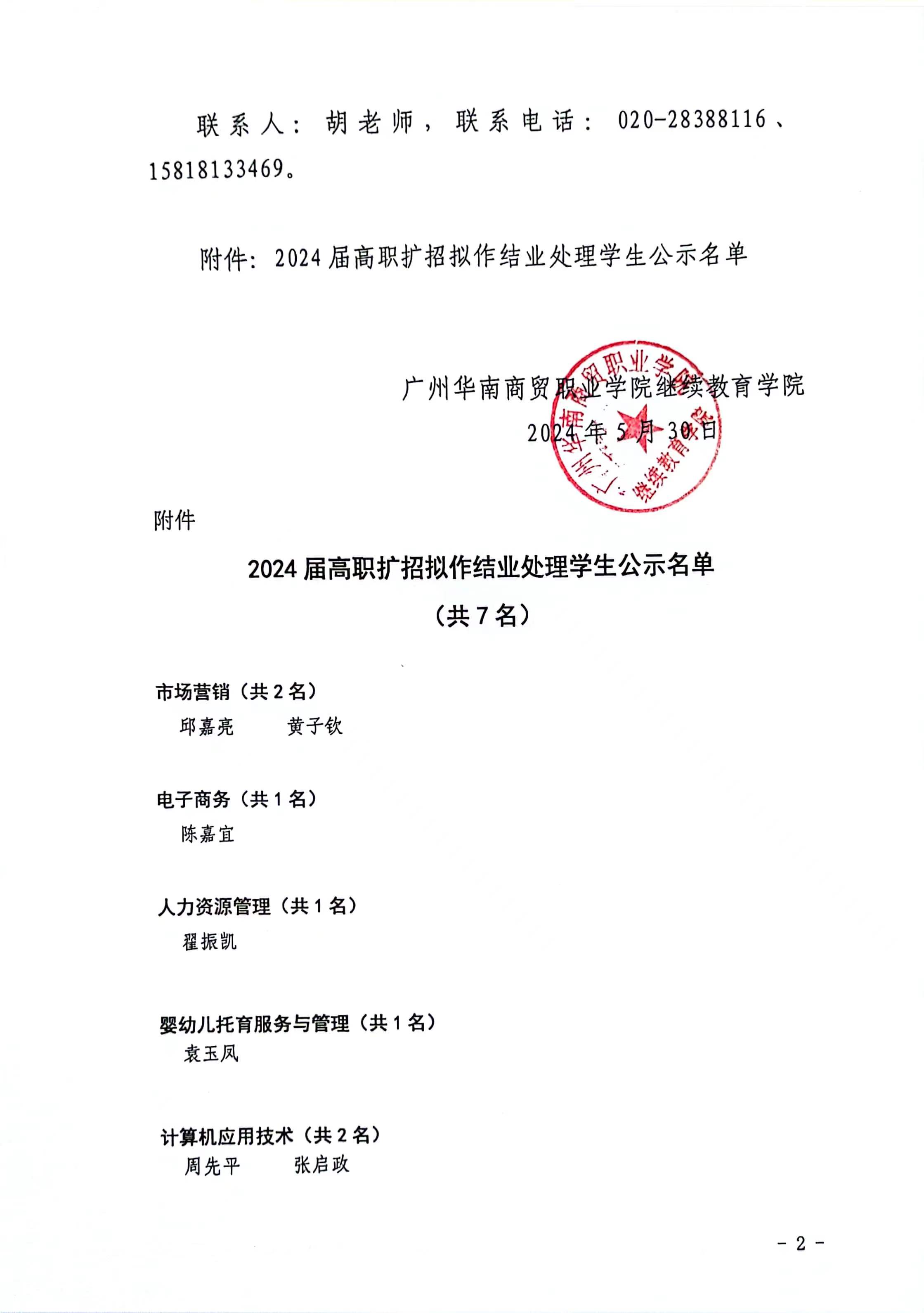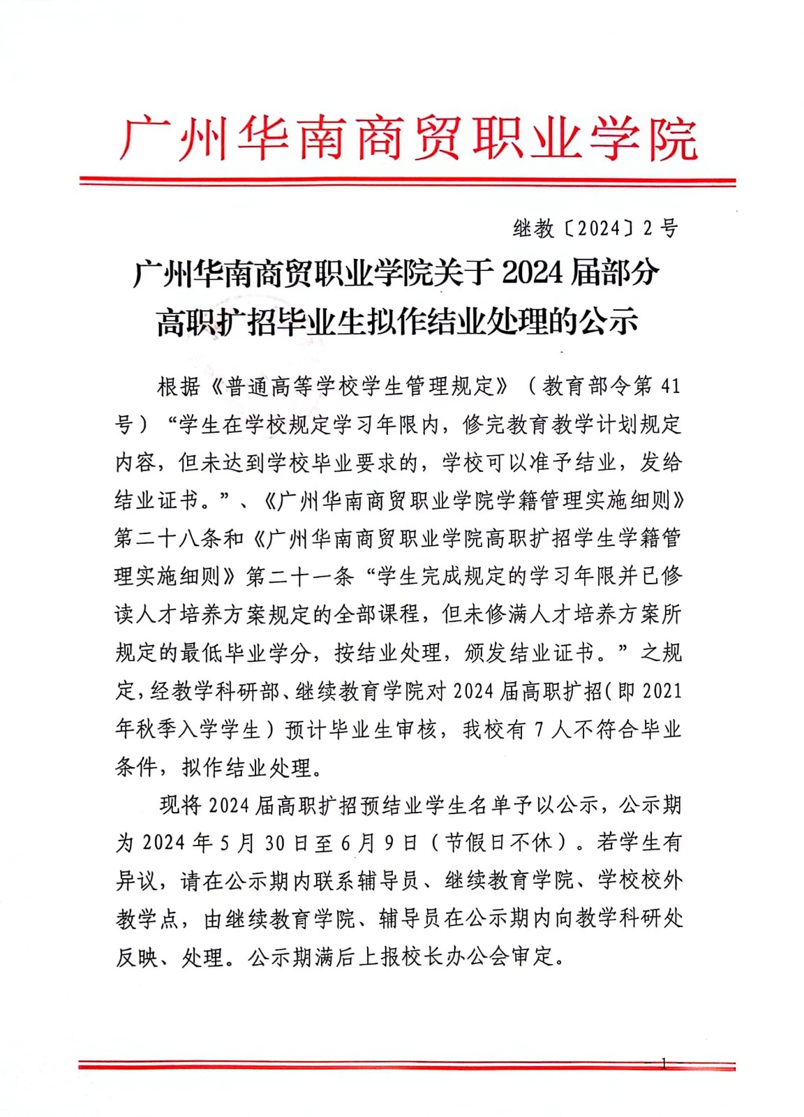 广州华南商贸职业学院关于2024届部分毕业生拟作结业处理的公示